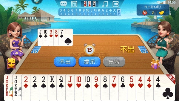 4、轮到自己出牌时,玩家可以选择点击提示, 就可以在你已有的牌里选出可以出的牌