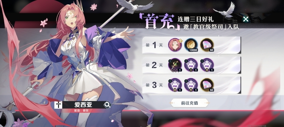 连续三天的的每日首充是非常划算的,只需要每天充值最低的那一档【6元】就可以获得全部奖励,分别是祭司角色【爱西亚】,4星治疗武器,金币,星钻,刻纹等回馈奖励。