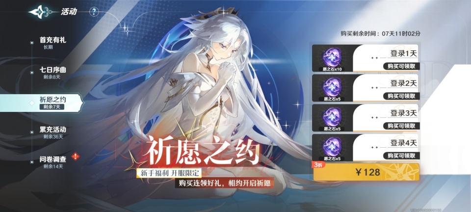 2、【祈愿之约】。这个也是非常划算的。128元,登录7天就可以获得【愿之石】*25个,相当于4500紫钻,是非常不错的充值途径。