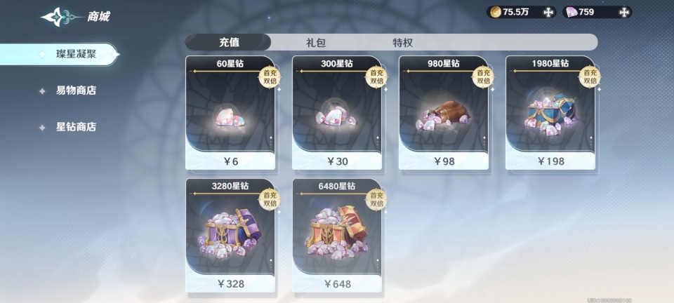 3、【首充双倍】。在首次充值6、30、98、198、328和648档位时或获得双倍星钻奖励。