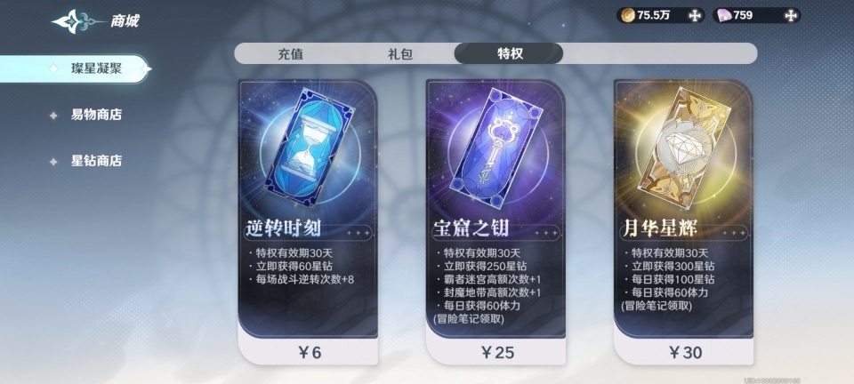 5、月卡。对于微氪和平民玩家而言,月卡是较为划算的充值方式。月卡有三种,分别为【逆转时刻】【宝窟之钥】和【月华星辉】。其中,【逆转时刻】能在挑战关卡失败时,回溯到之前的一定操作,使玩家可继续游戏且不消耗挑战次数;【宝窟之钥】类似体力月卡,能增加特殊副本的挑战次数;【月华星辉】则可让玩家每日获得星钻。